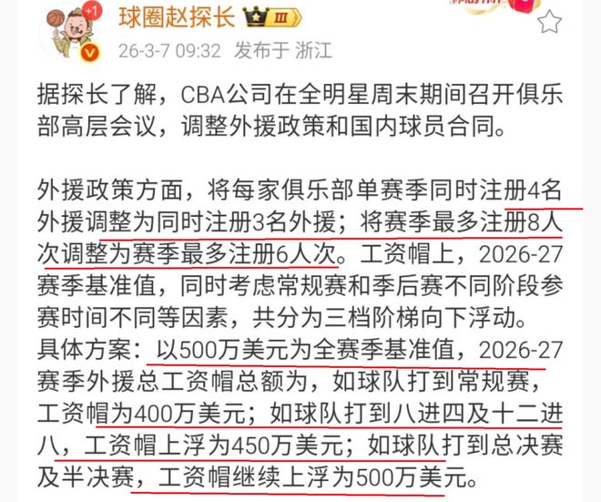此外,在外援的工资方面,也是进行调整,本赛季,外援的总工资帽为500万美元,下赛季,将会调整到400万美元。当然了,还会设置一些浮动,季后赛进入八强的球队,外援总工资帽调整到450万美元;闯进CBA总决赛的球队,外援总工资帽调整到500万美元。