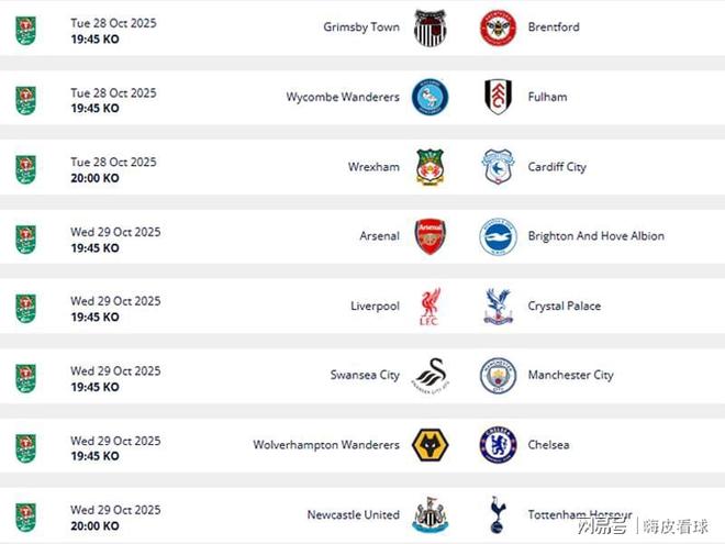 联赛杯16强阶段,只有一场比赛没有英超球队参与,英冠的雷克瑟姆主场迎战英甲的卡迪夫城。另外,富勒姆客场挑战英甲的韦康比流浪者,以及布伦特福德客场挑战英乙的格林斯比,两场均为英超中游球队的舞台。一路高歌猛进的格林斯比,还能不能继续神奇的表演,值得期待。